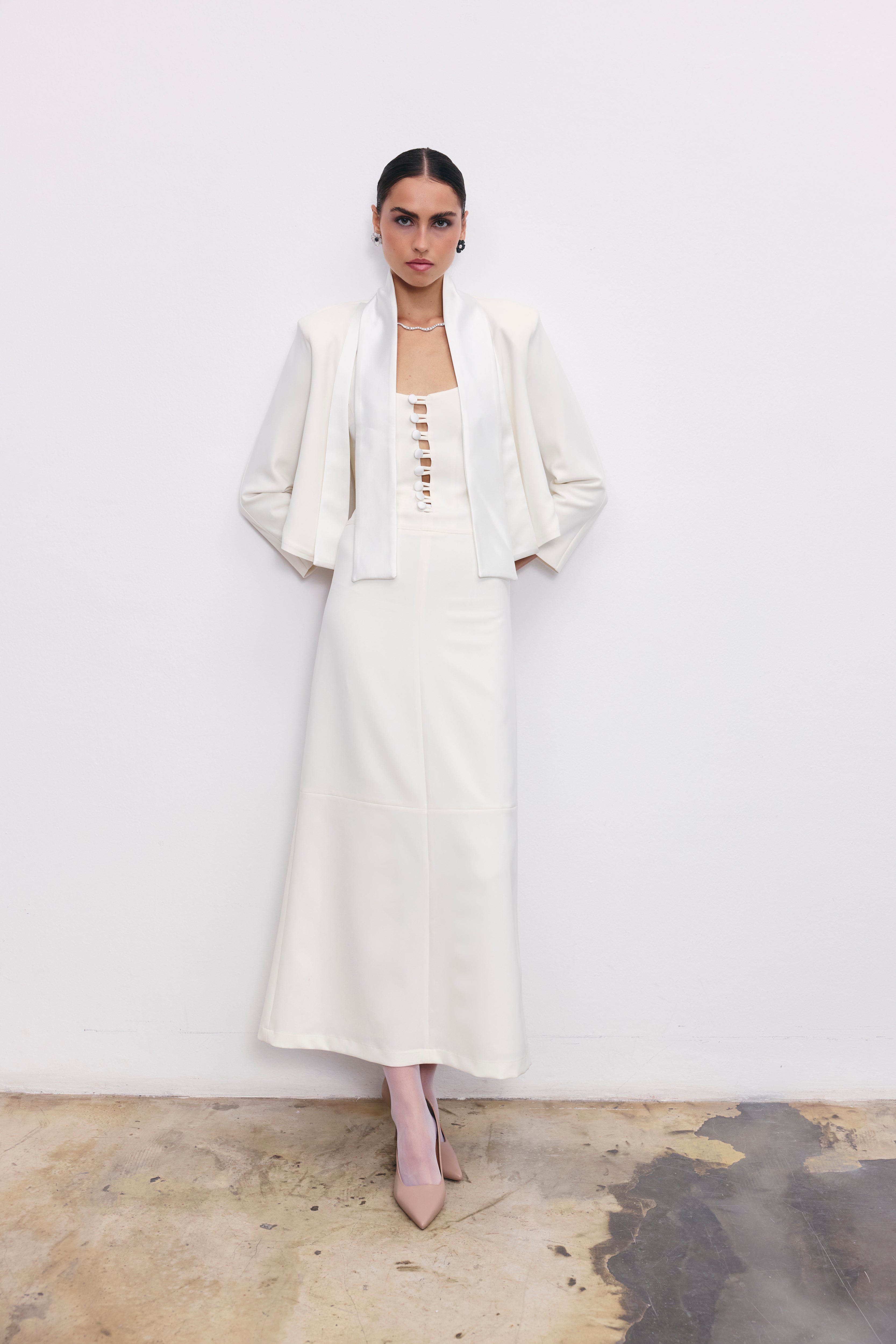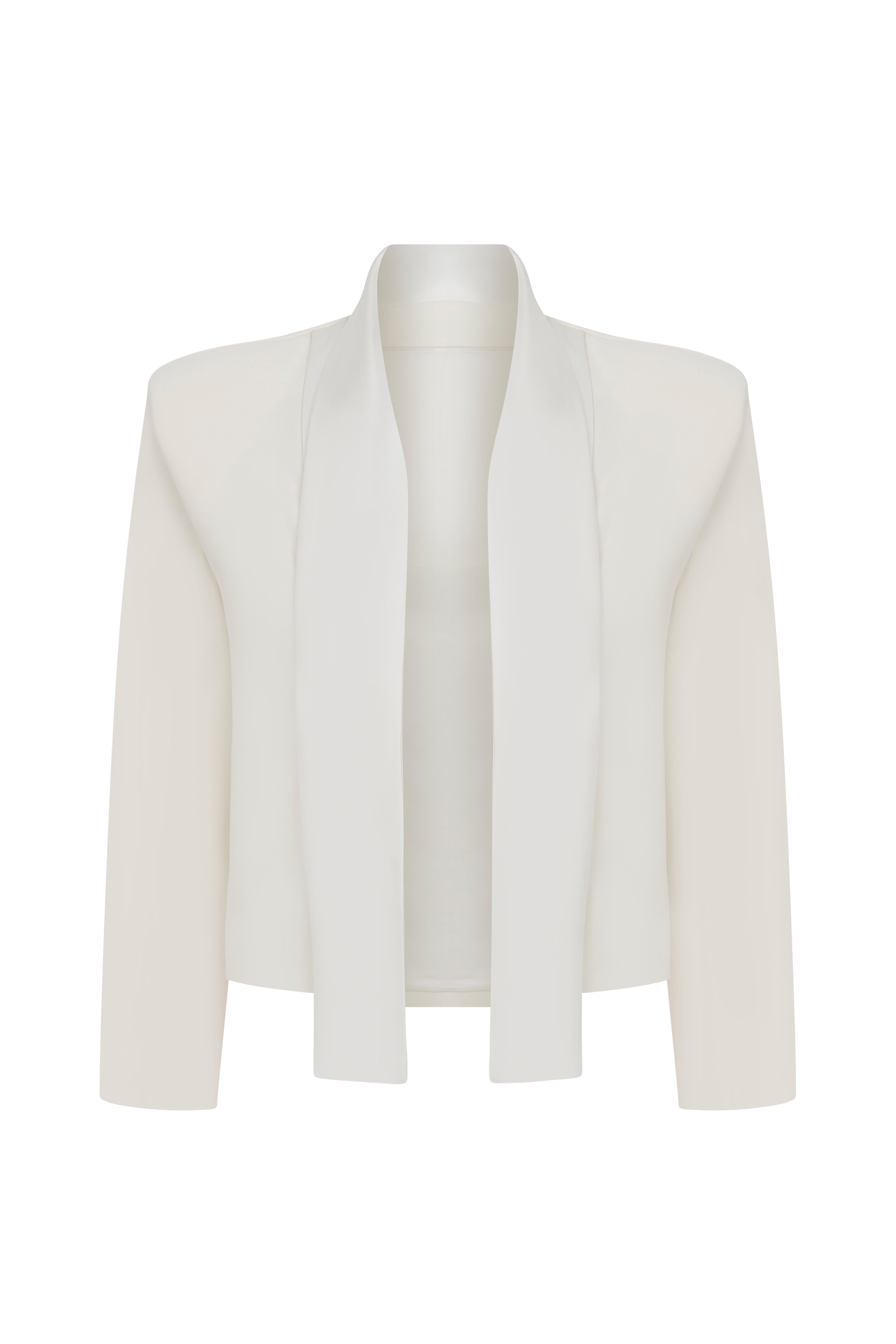 Emma krep ceket, modern çizgilerle klasik şıklığı buluşturur. Kısa formu ve dökümlü krep saten kumaşıyla hafif bir parlaklık sunar. Şal yaka görünümünü tamamlayan ekstra şal detayıyla özgün ve feminen bir duruş kazandırır. Elbiseler ya da yüksek bel pantolonlarla kolayca kombinlenebilir.