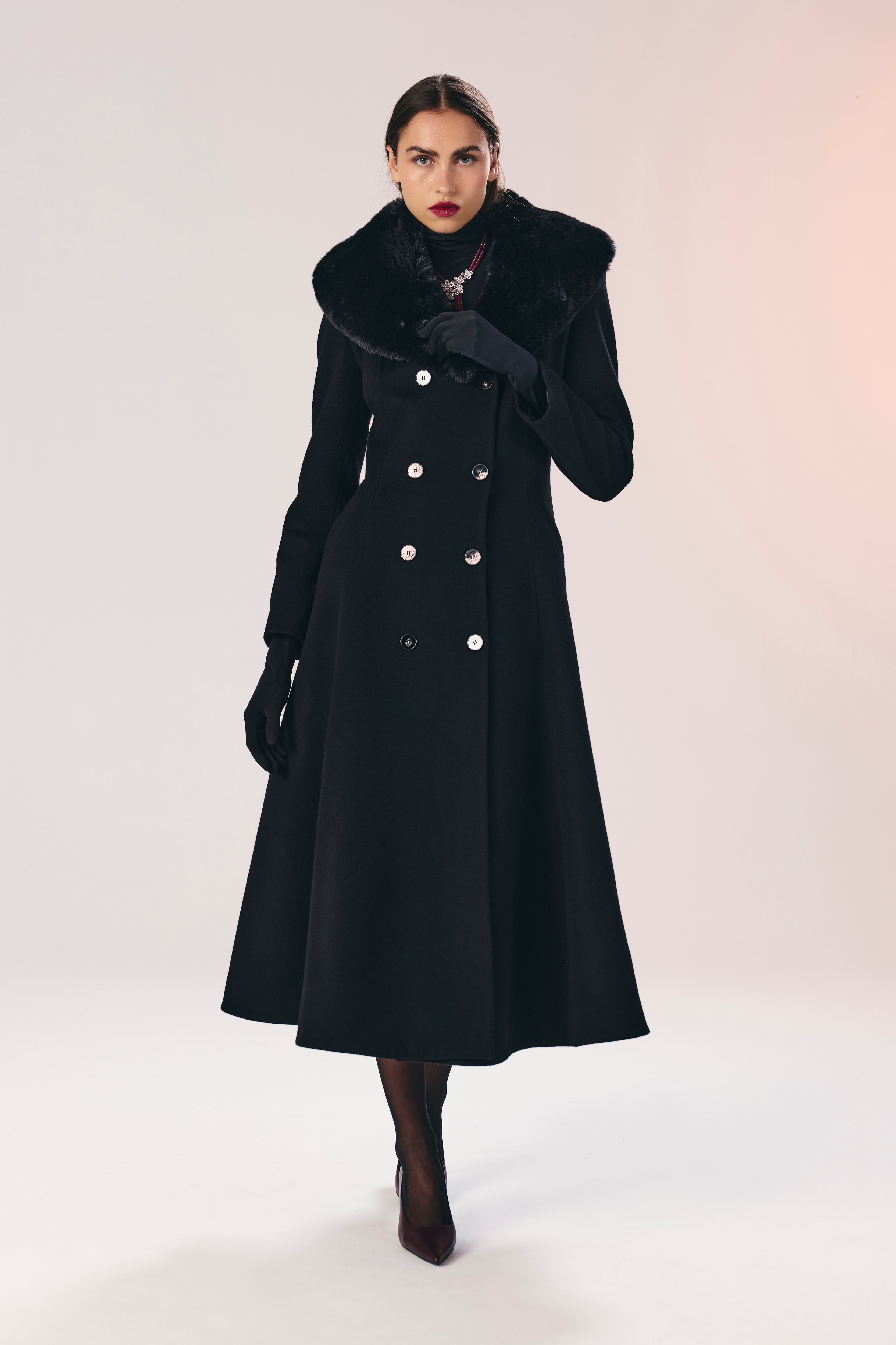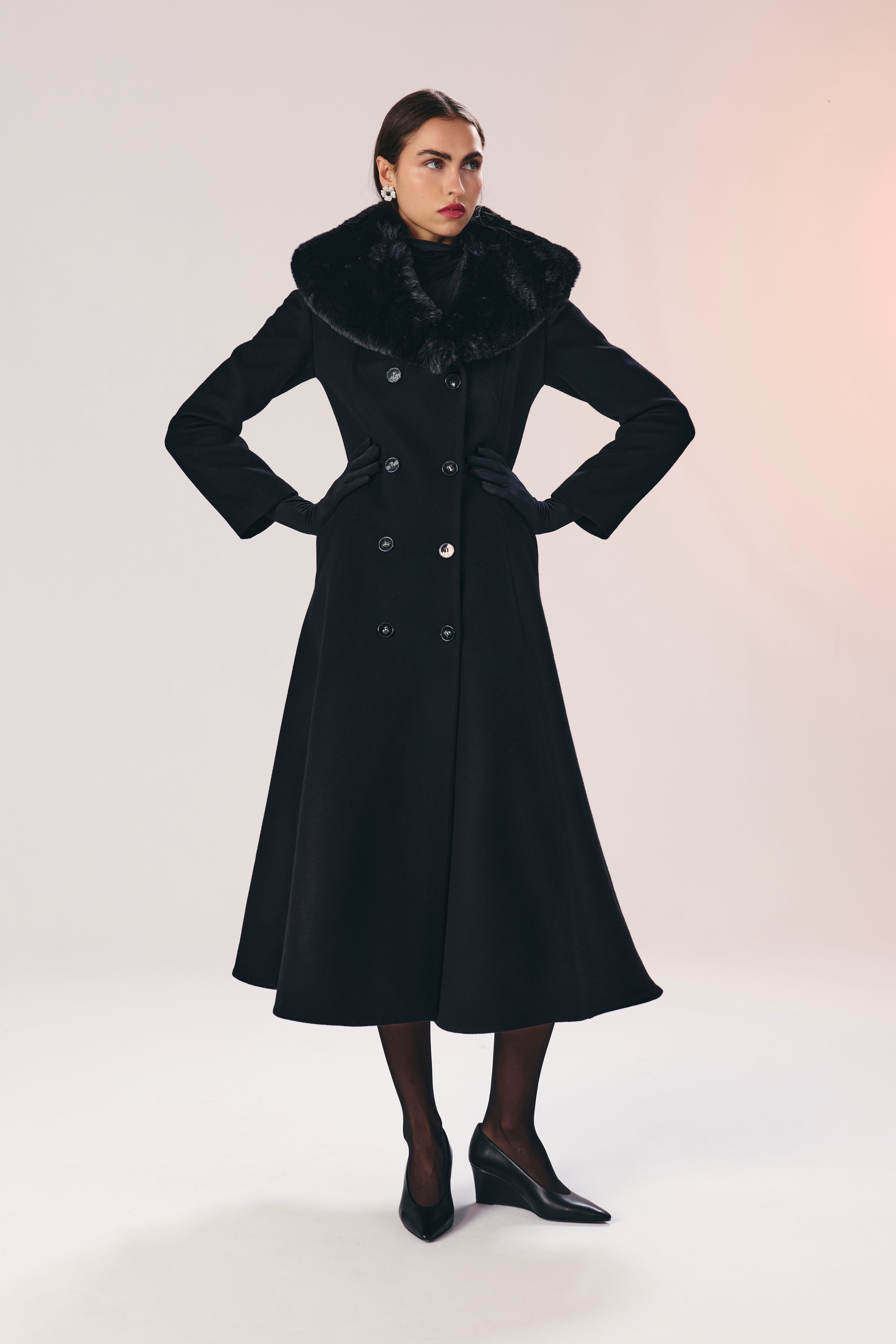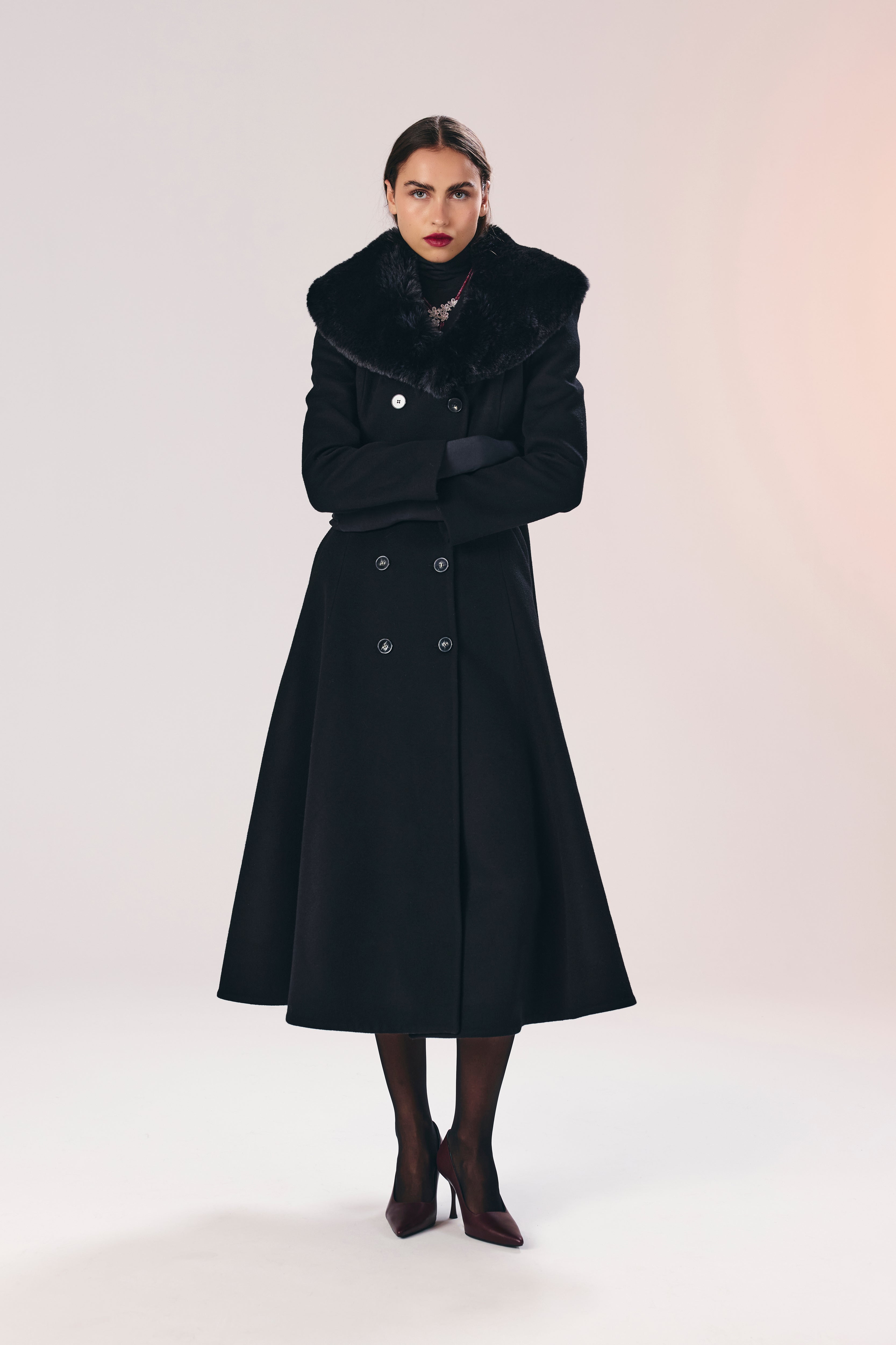 Estelle yün kaban, siyah tonların asaletiyle birleşen havalı kürk yaka detayı ve feminen kesimiyle dikkat çeker. Fit-and-flare silueti, bel hattını vurgularken güçlü ve zamansız bir duruş sunar. Soğuk havalarda stil sahibi görünüm arzulayanlar için tasarlandı.