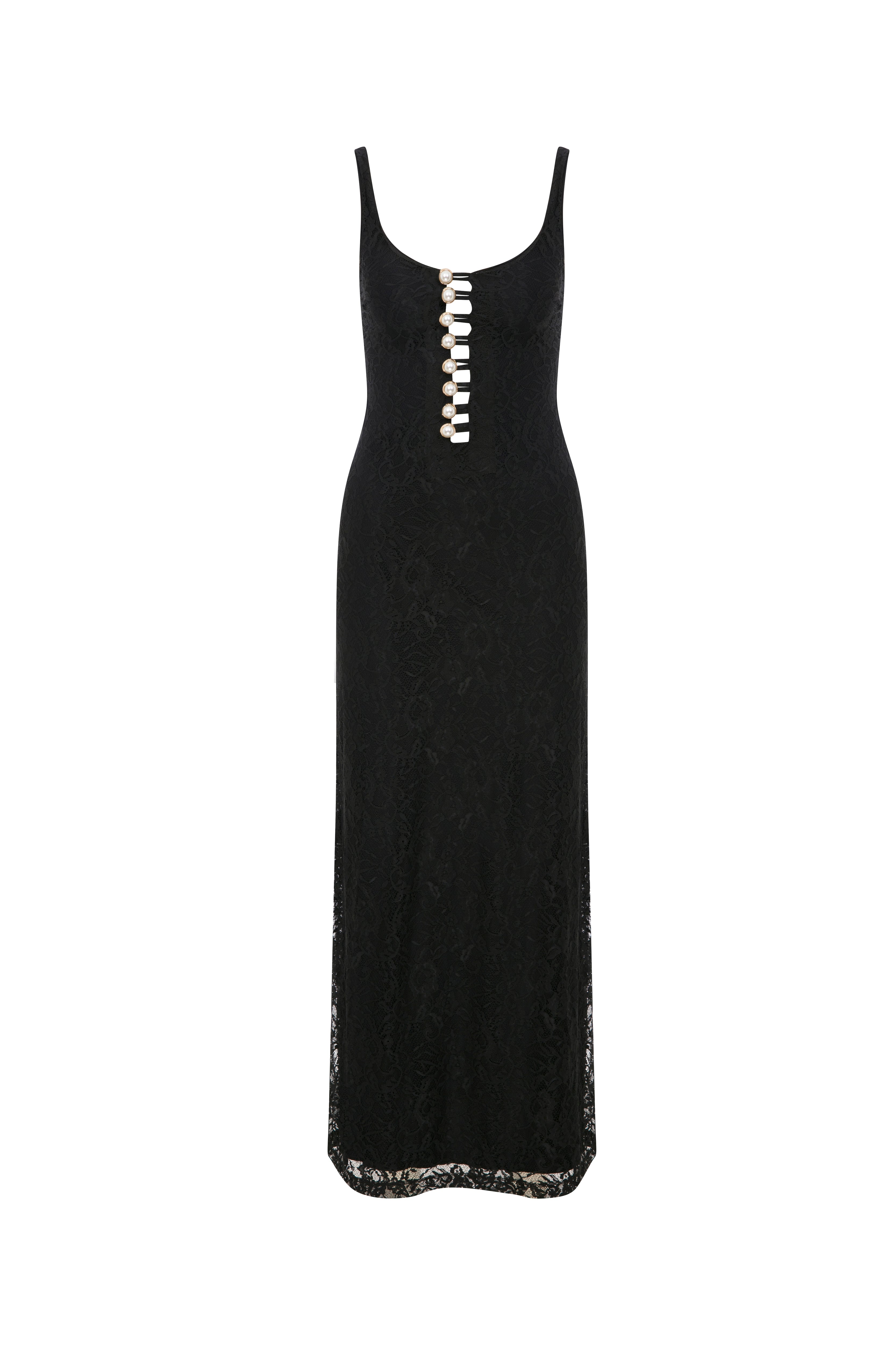 - Elbise: Dantel kumaş, ön yüzünde inci görünümlü düğmeler, astarlı