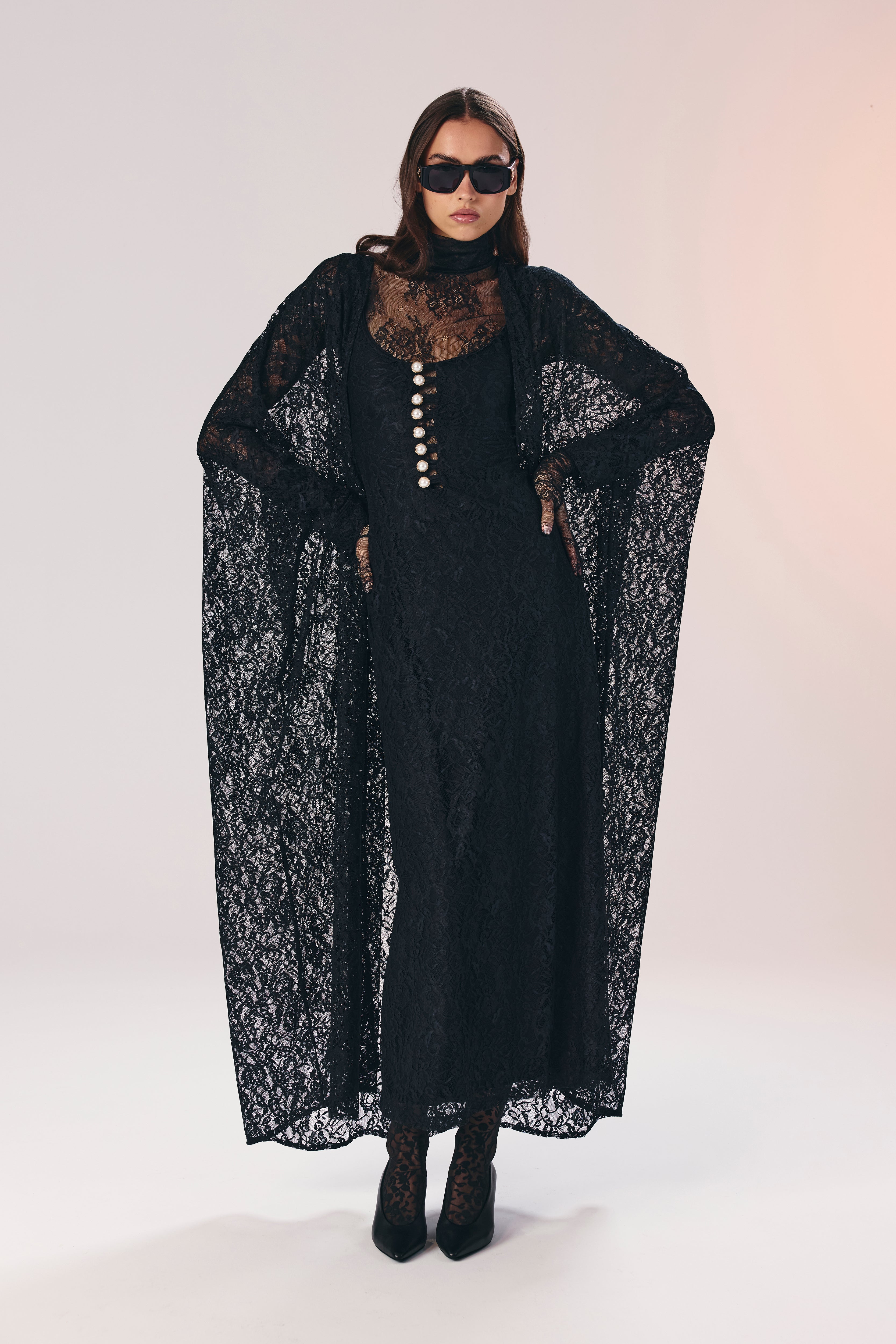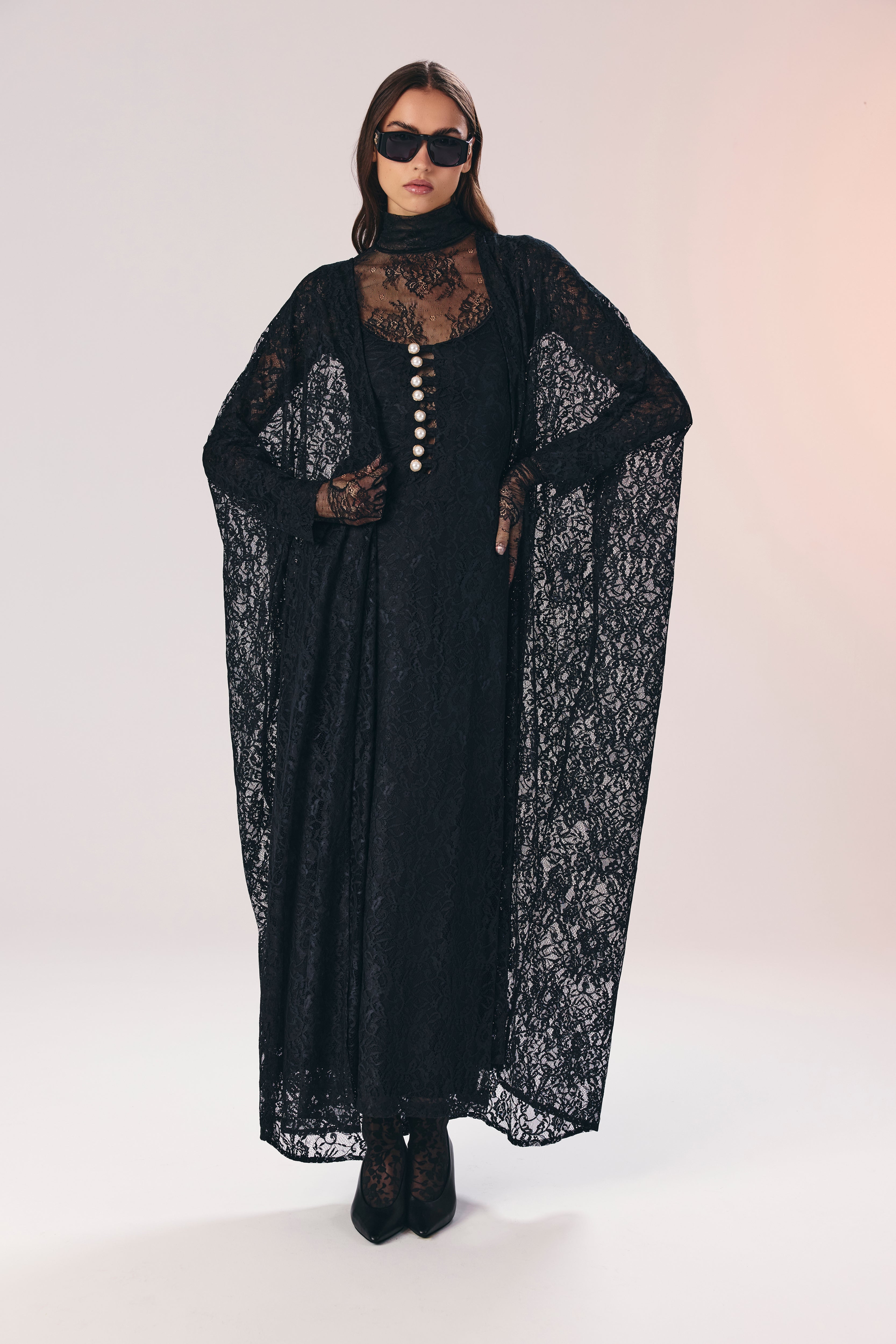 Romantik ve zarif bir görünüm sunan Be Happy takımı, inci görünümlü düğme detaylarıyla süslenmiş dantel maxi elbise ve onu tamamlayan uzun abaya ile sunulur. Elbisenin ton sür ton astarı sayesinde tam kapatıcılık sağlanırken, ayarlanabilir askıları ve dikişsiz yapısı konforlu bir deneyim sunar. Hafif ve dökümlü abaya ise görünümünüze zarafet katarken, özel günler ve davetler için ideal bir tamamlayıcı olur.