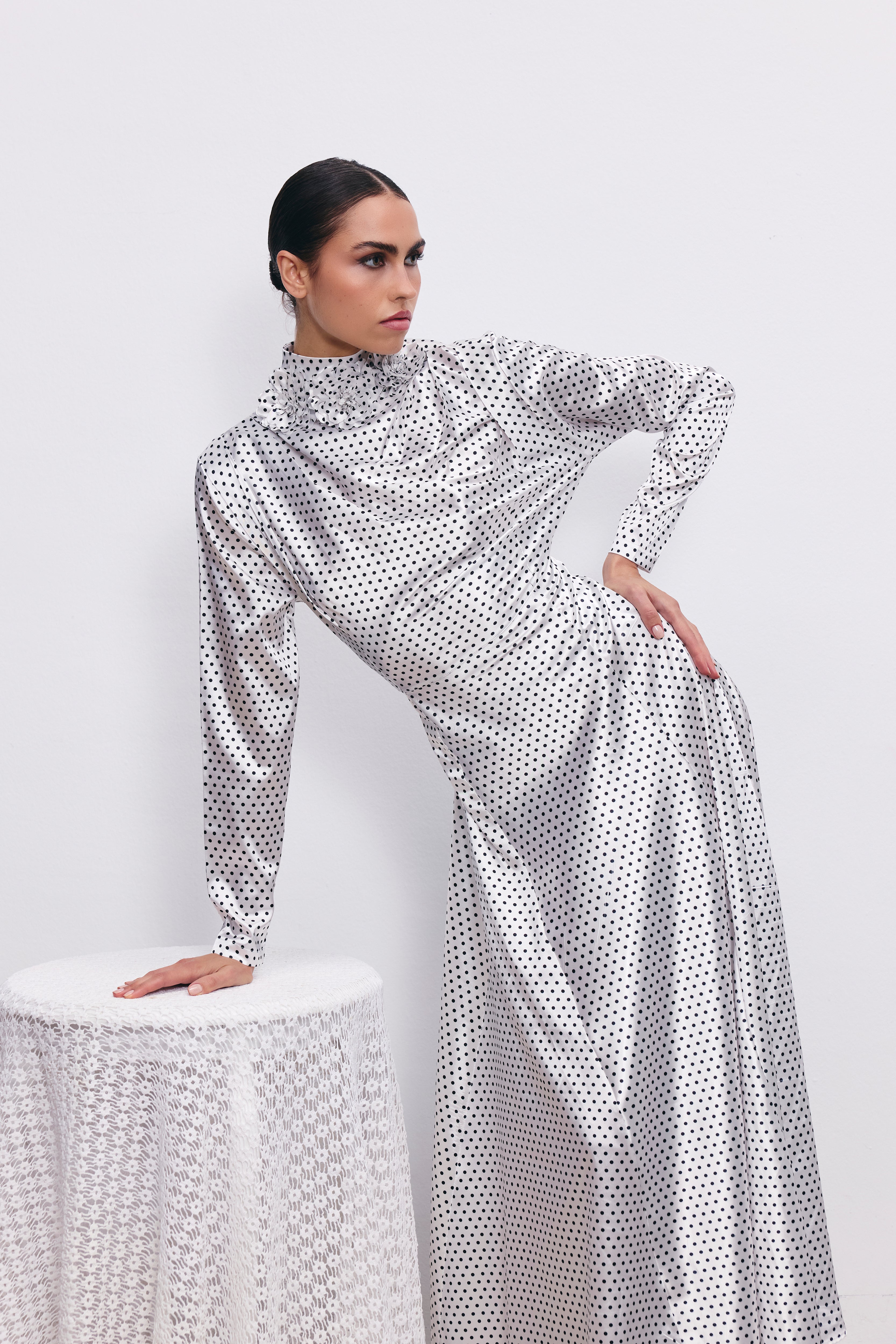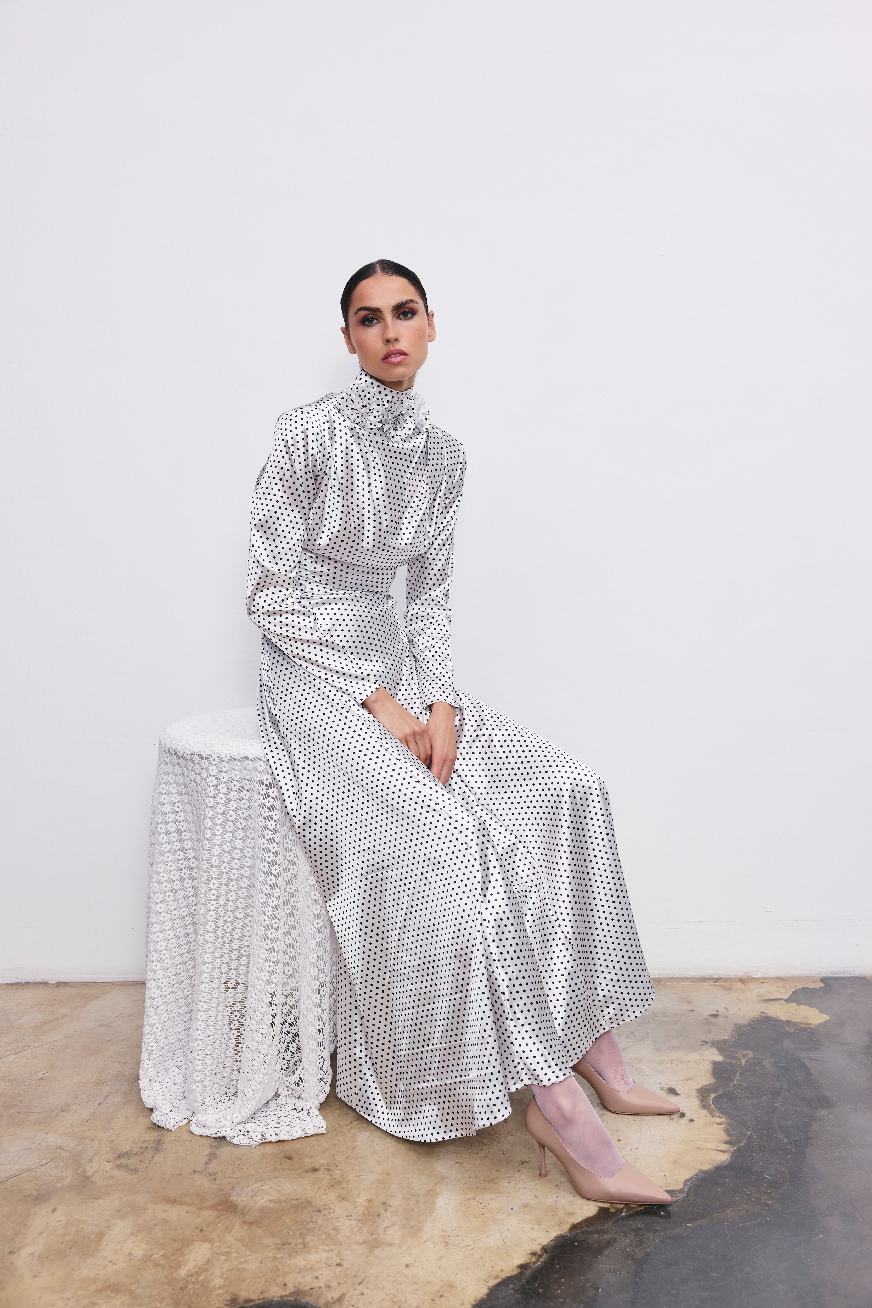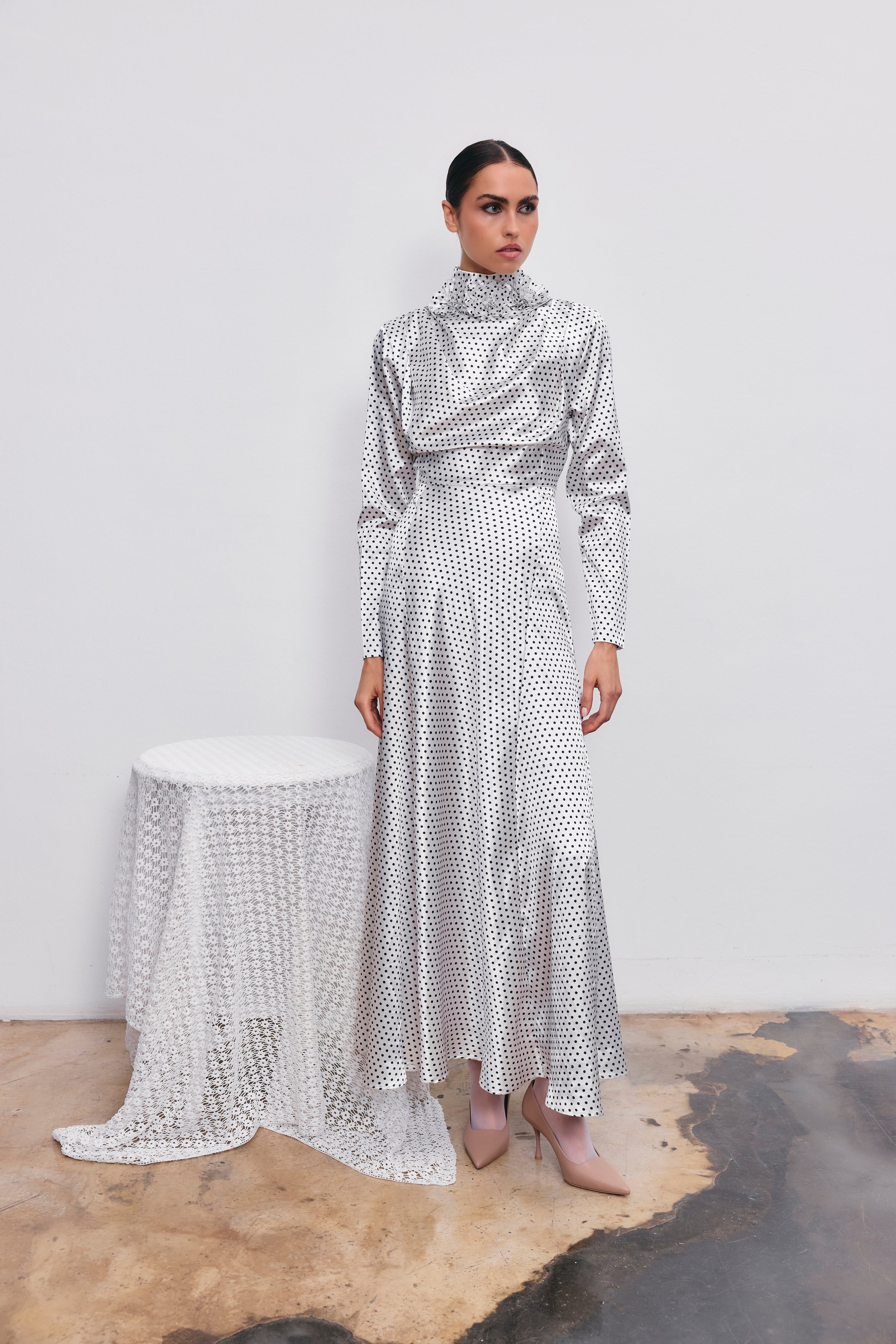 Helena elbise, satenin yumuşak dokusu ve klasik puantiye deseniyle 1950’lerin şıklığını bugüne taşıyor. Yüksek balıkçı yakasında yer alan çiçek detayı, tasarıma romantik ve couture bir hava katarken, uzun kolları ve dökümlü formuyla sofistike bir siluet sunuyor.