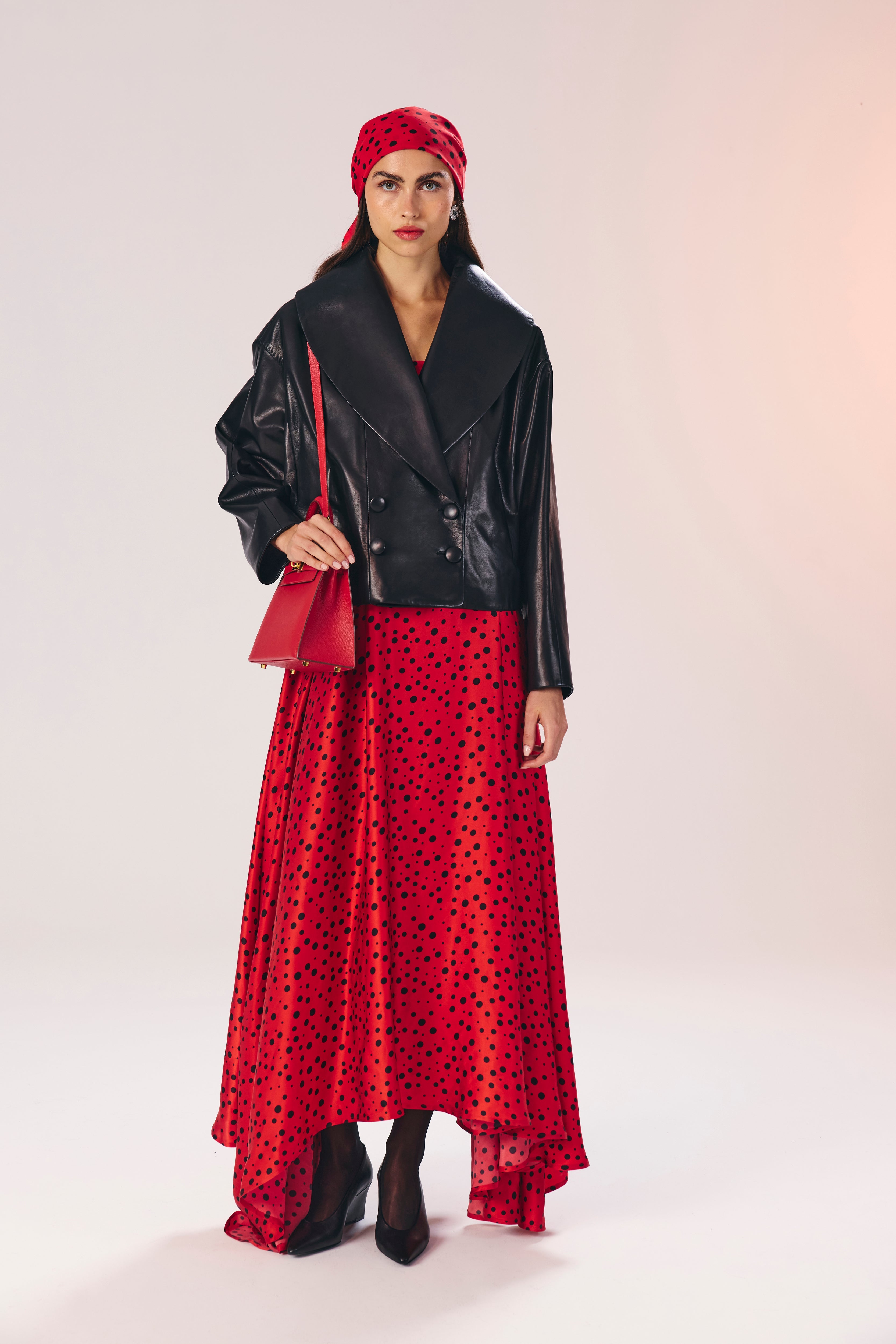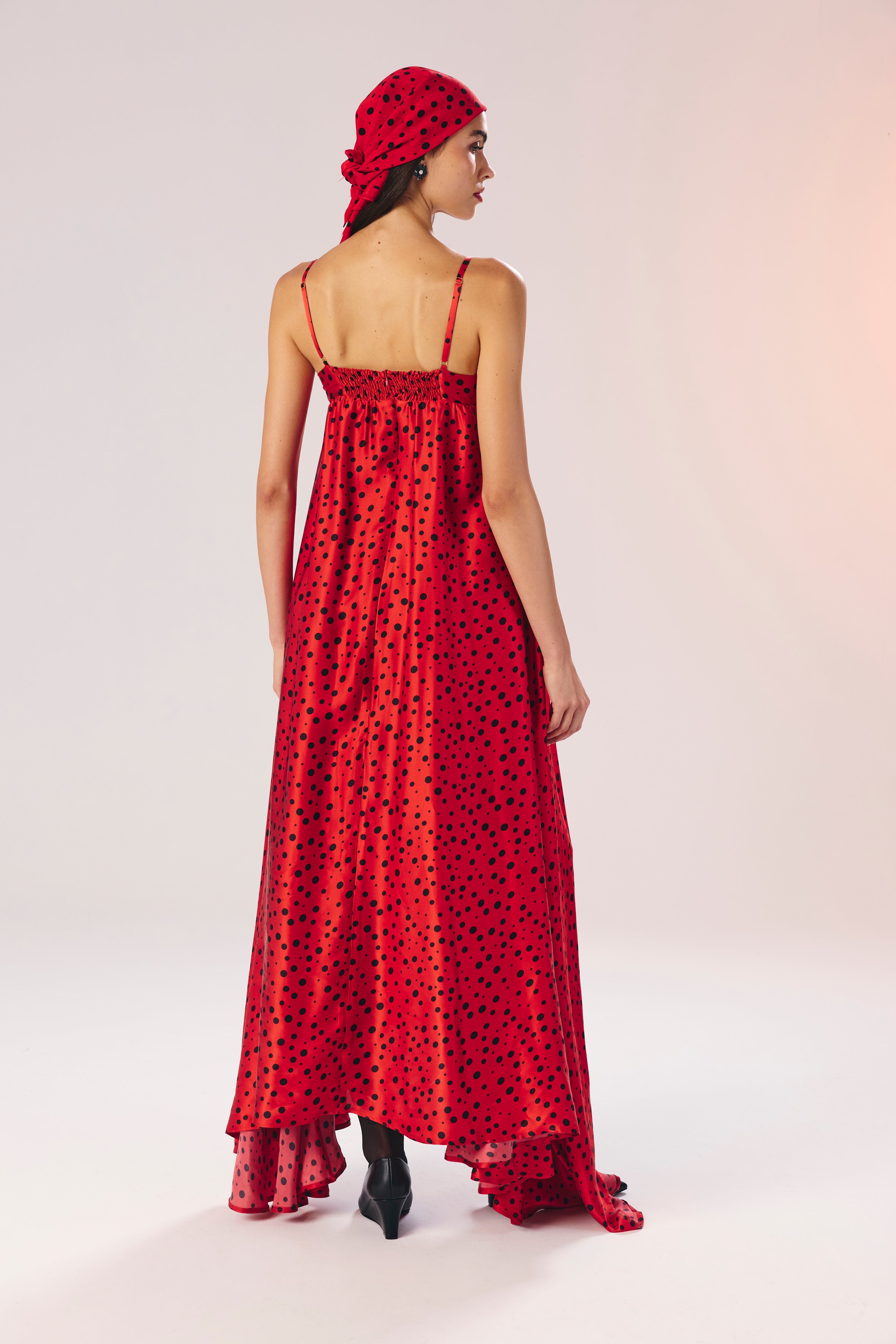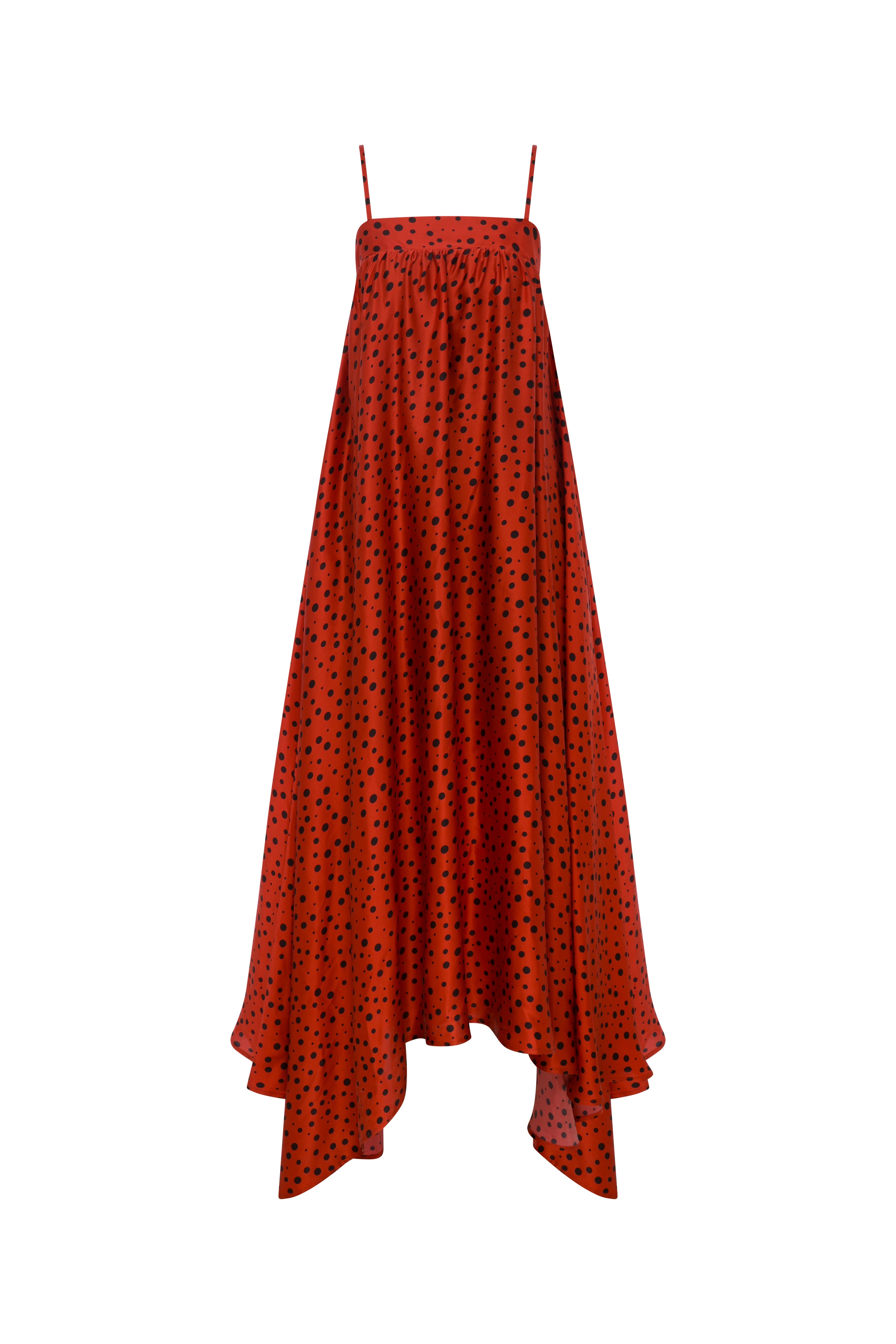 1950’lerden 60’lara uzanan bol elbiselerin rahat şık stillerinden ilham alan Letizia elbise, zamansız siyah puantiyelerle süslenmiş canlı kırmızı zeminiyle ilgi uyandiriyor. İnce askılar tasarıma sadelik katarken, göğüs ve belde oturan form, yumuşak asimetrik etek ucuna doğru zarif bir siluet oluşturuyor.