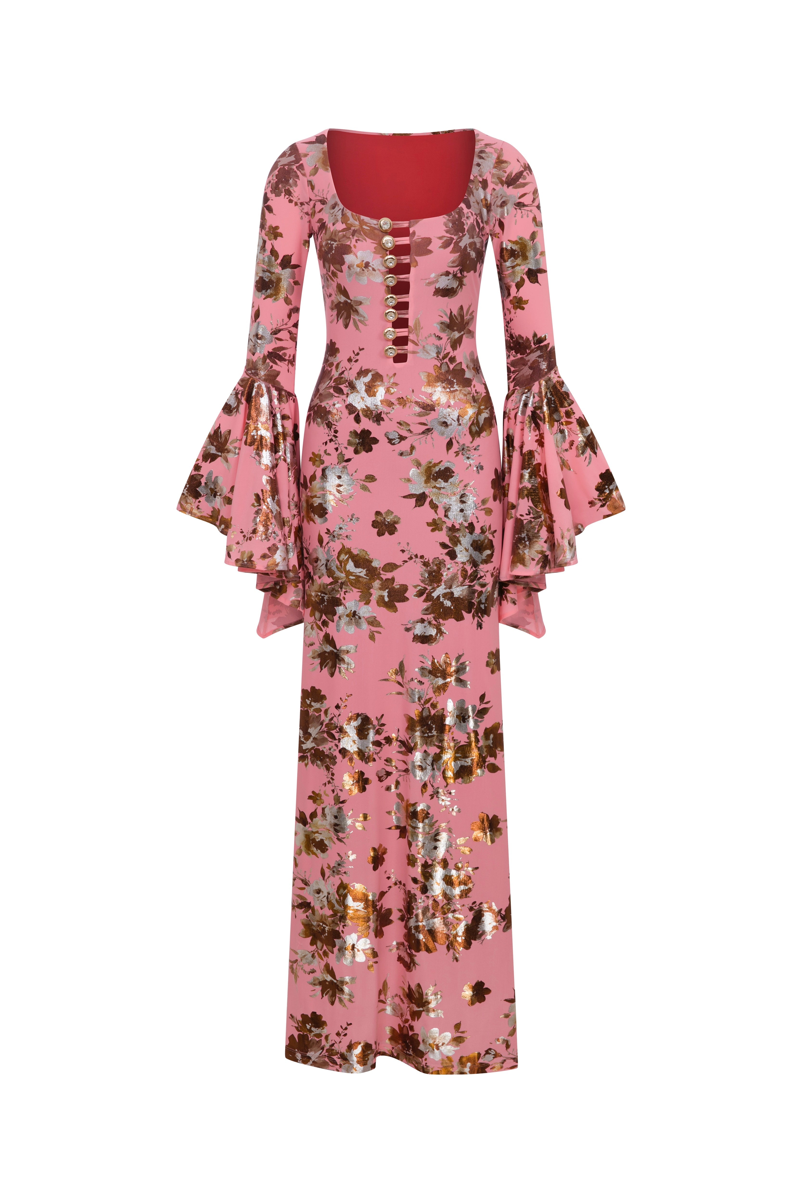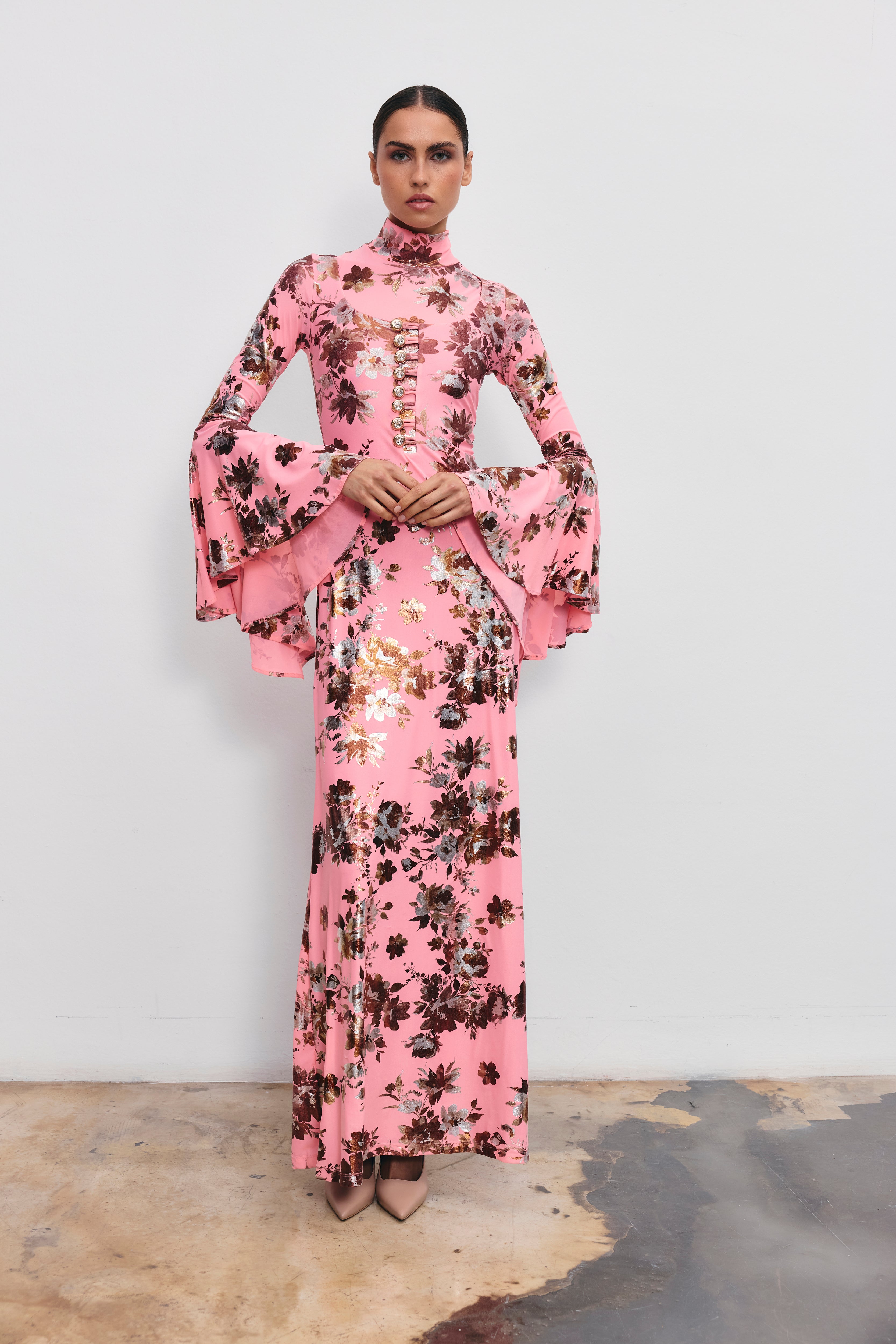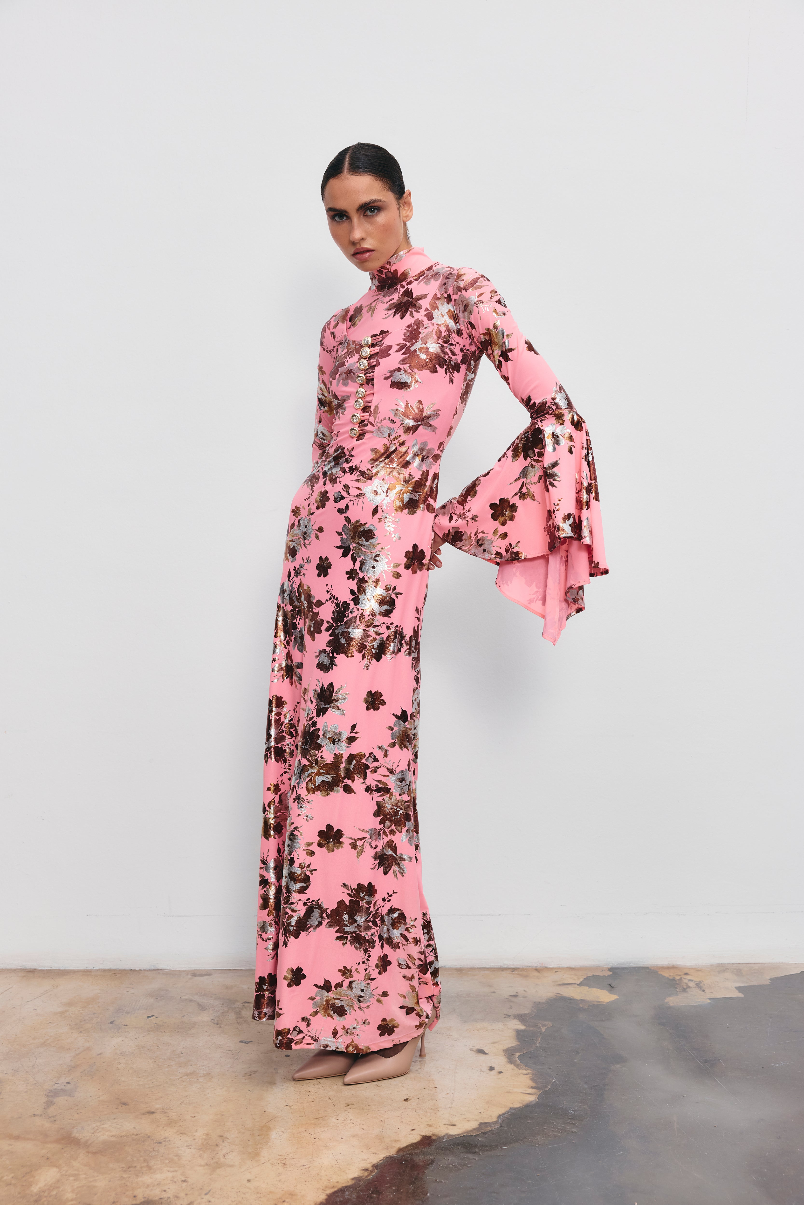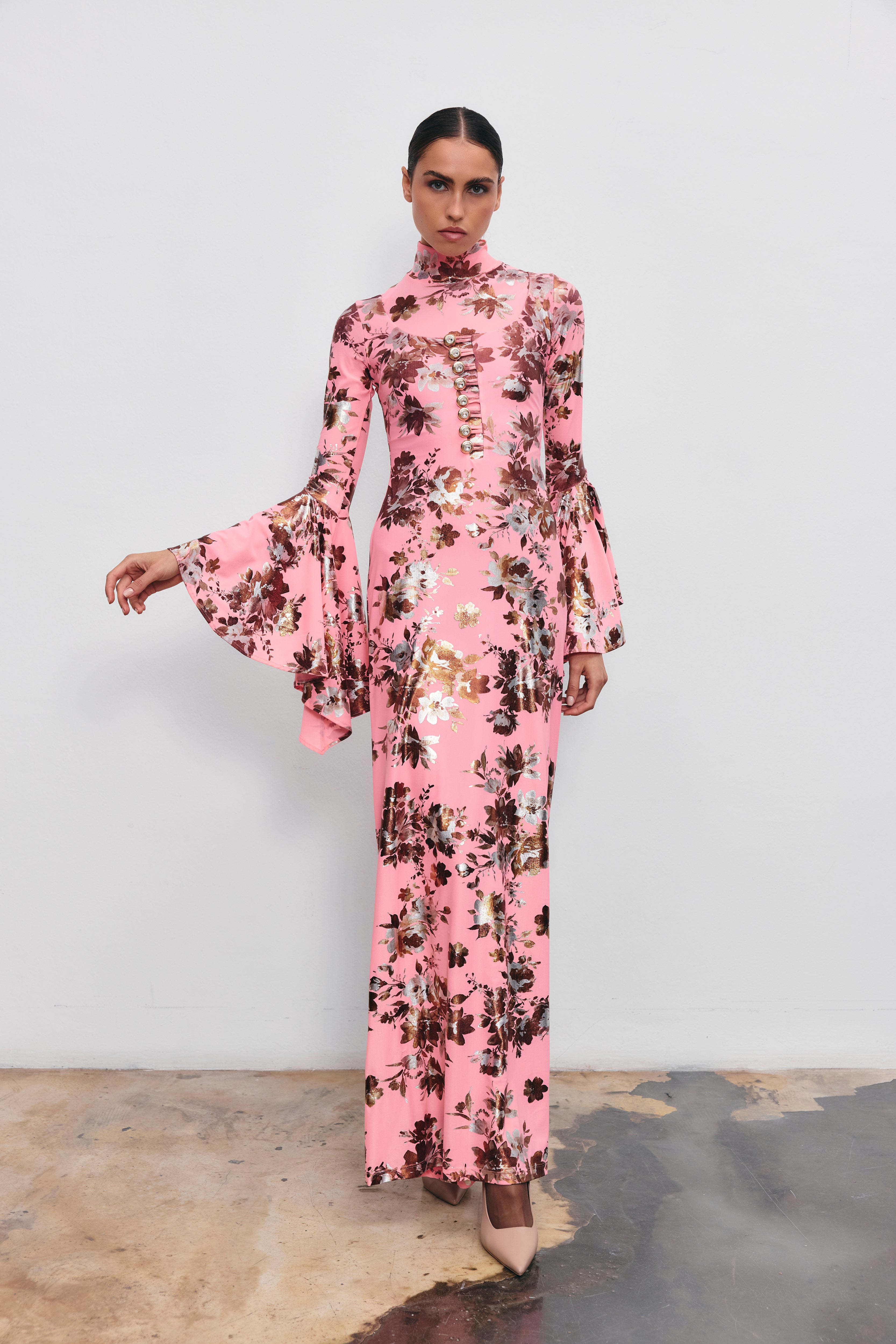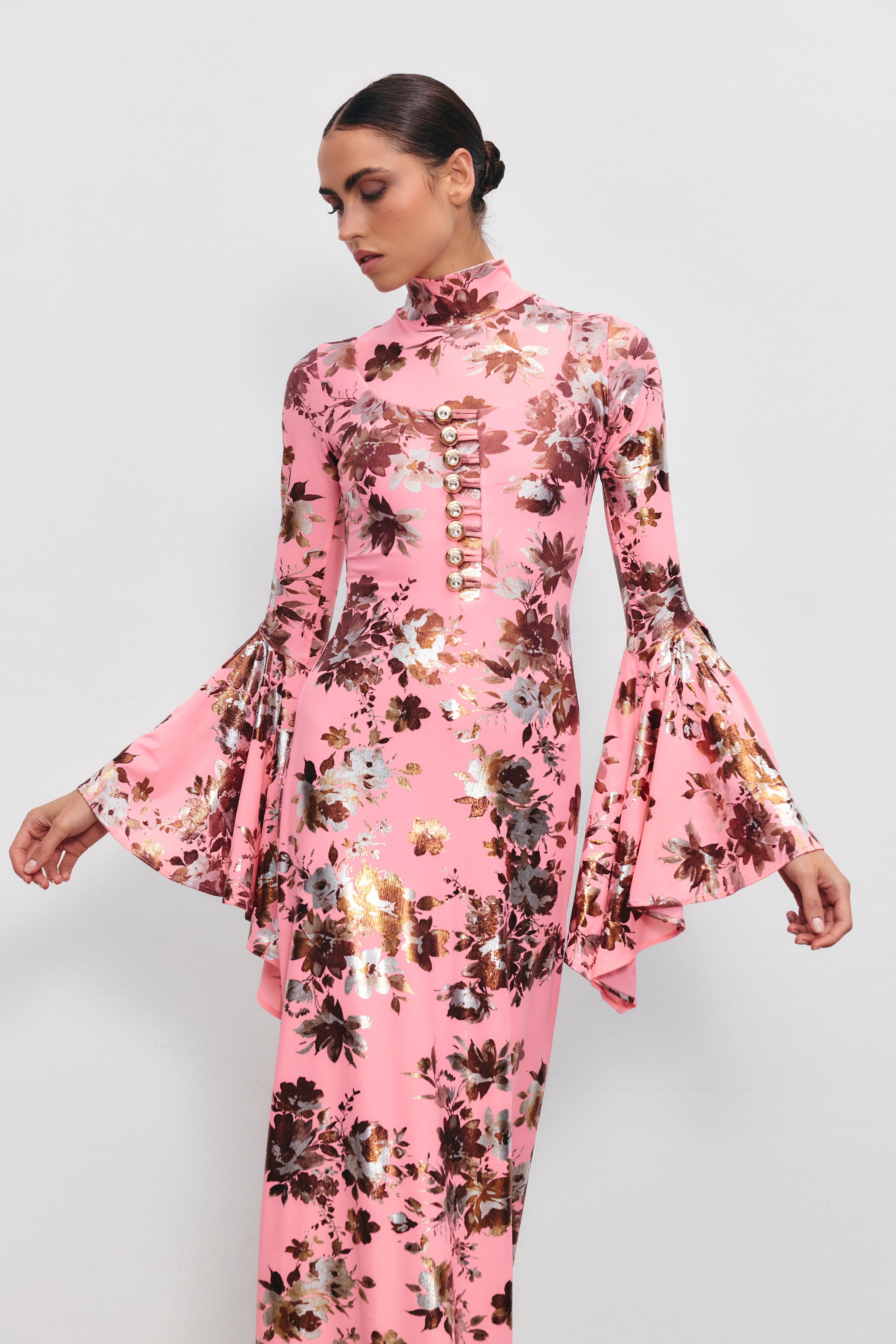 Ultra soft jarse kumaştan üretilen maxi elbise, dramatik İspanyol kol detayıyla ön plana çıkıyor. Ön bölümdeki altın ve mücevher detayli düğmeler zarif bir tamamlayıcıdır.