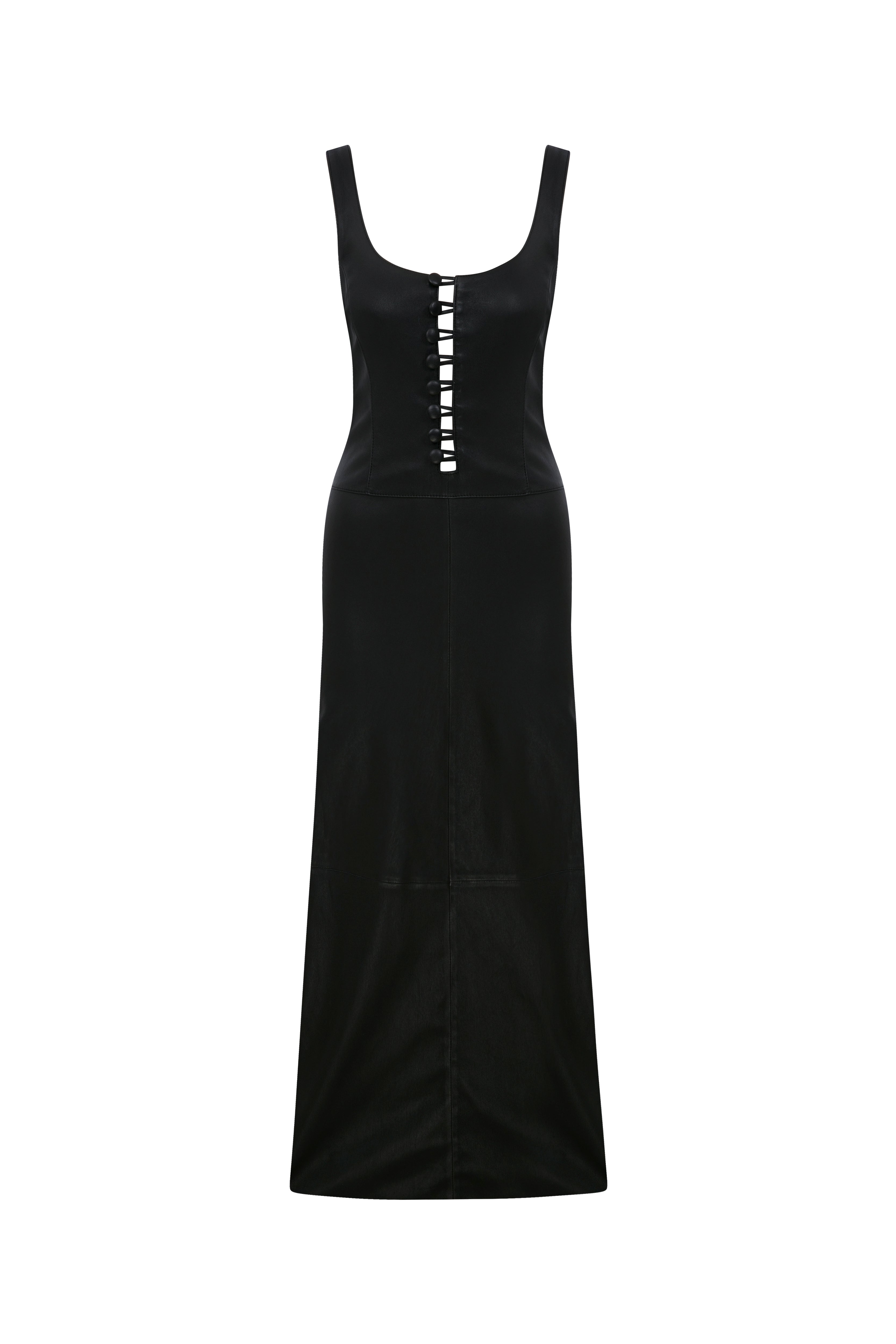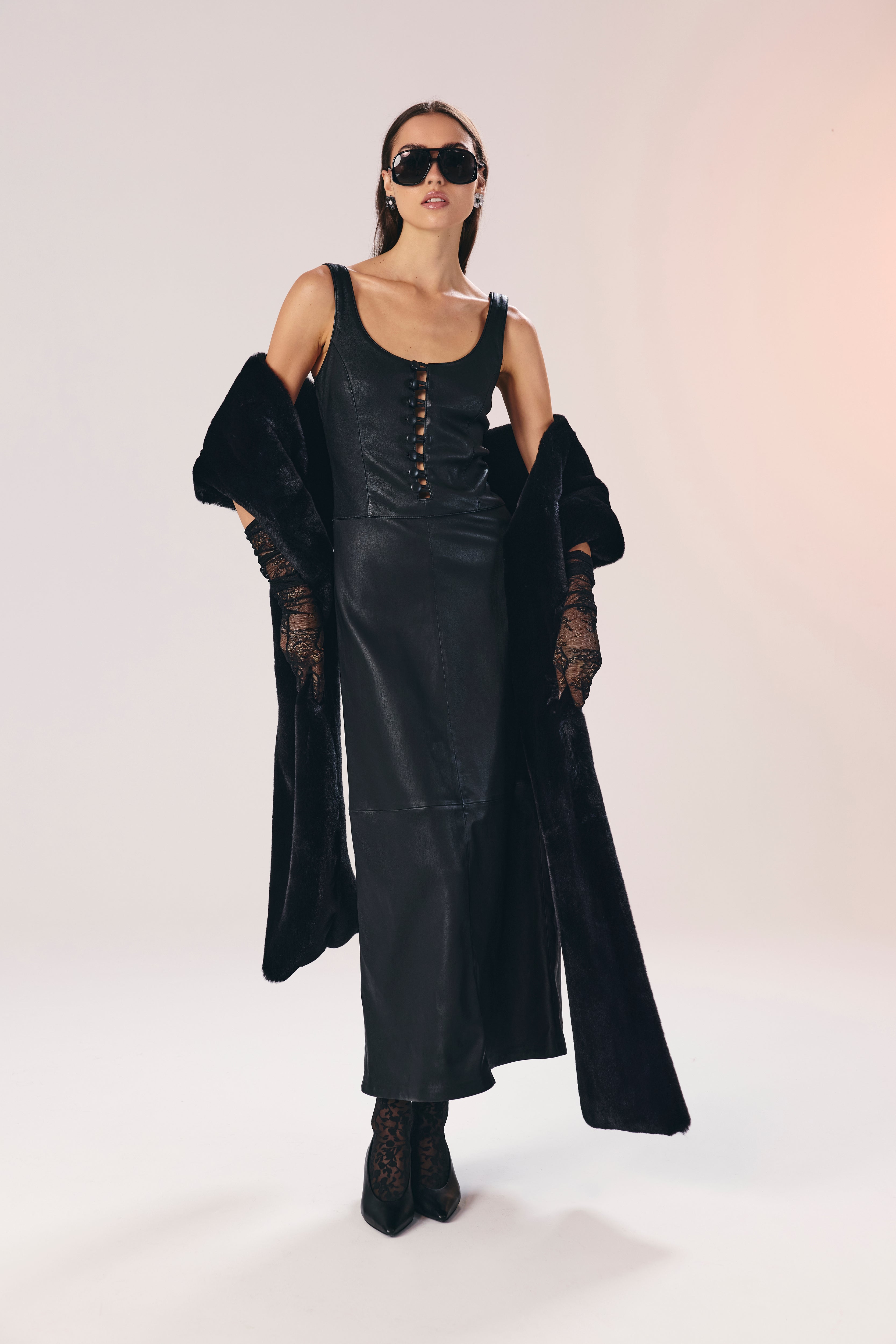 %100 Kuzu derisinden üretilen Be Happy askılı elbise, daha feminen bir siluet ile yeniden yorumlaniyor. Önden düğme detayıyla kolay giyilebilir, esnek kuzu derisi kumaş sayesinde rahat hissettirir. Tek başına ya da bir ceket veya bluz ile kombinlenerek kullanılabilir.