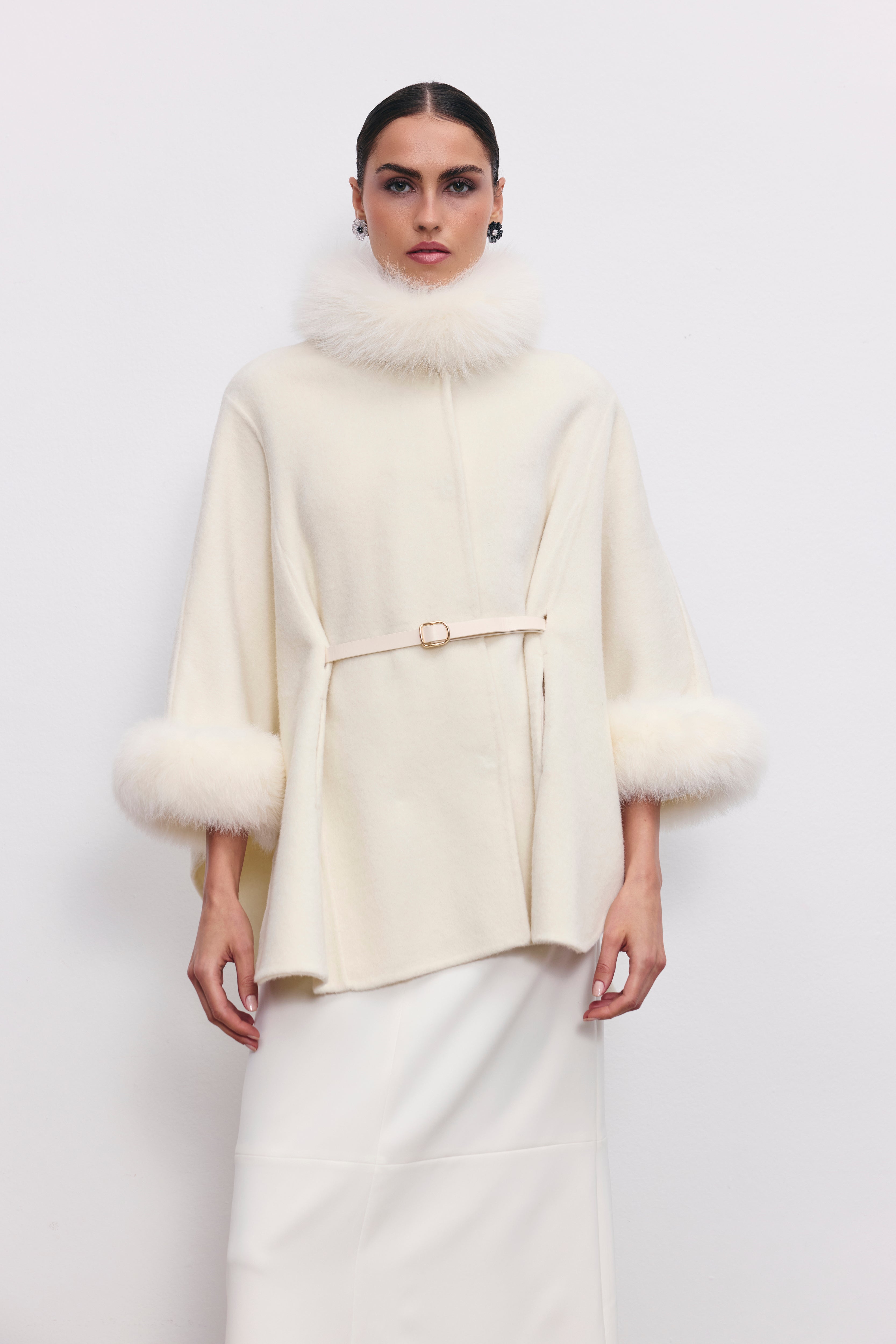 Zamansız bir duruşla tasarlanan Elizabeth Cape, gerçek kürk detayları ve tak-çıkar özelliğiyle soğuk günlerde şıklığınızı tamamlar. Belde yer alan kemer detayı, nazikçe büzgü görünümü kazandırırken vücut formunu zarifçe vurgular. Kırık beyaz rengi ve yün dokusu ile 50’lerden ilham alan nostaljik ama modern bir siluet sunar.