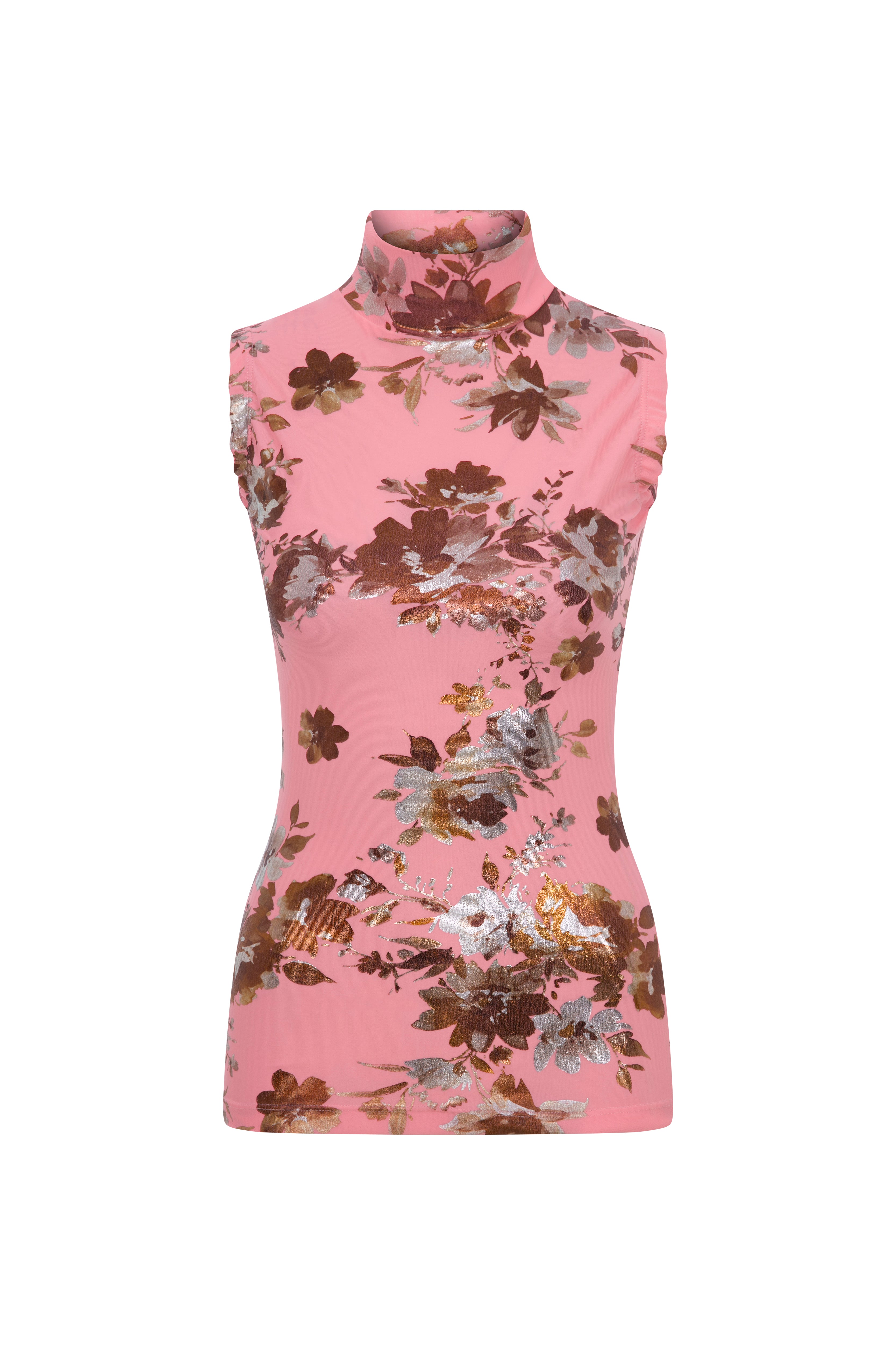 Yumuşak pembe zemin üzerine yerleştirilmiş ışıltılı taraklı çiçek desenleriyle dikkat çeken, vücudu saran likralı kumaştan üretilmiştir. Yarı balıkçı yaka ve kolsuz kesimiyle gün boyu şık ve konforlu bir görünüm sunar.